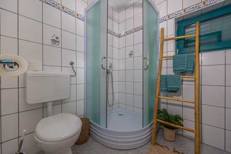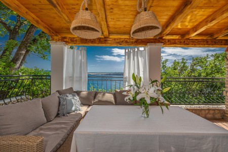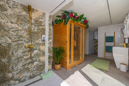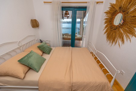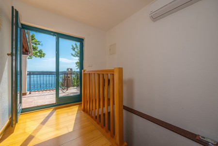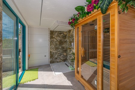 Haus für 6 Personen: ca. 200 m², auf drei Etagen. Im Erdgeschoss befinden sich eine Infrarotsauna und ein Badezimmer mit Dusche und WC. Von hier aus gelangt man direkt auf die Terrasse mit Whirlpool und Blick auf das Meer. Eine Etage höher befindet sich die Küche mit Wohnbereich und einer gemütlichen Couch. Von hier aus geht es auf den überdachten Balkon, auf dem ein Essbereich im Freien mit Tisch und Stühlen zur Verfügung steht. Zudem gibt es einen Grill, sodass Sie Ihre Mahlzeiten mit wunderschönem Meerblick genießen können. Außerdem gibt es auf dieser Etage ein Schlafzimmer mit Doppelbett sowie ein separates WC mit Waschmaschine. Im zweiten Stock befinden sich zwei weitere Schlafzimmer, jeweils mit einem Doppelbett ausgestattet. Ein Schlafzimmer hat direkten Zugang zu einem Balkon mit einem hängenden Tagesbett und Meerblick. Auch vom Flur aus kann man diesen Balkon betreten. Im Flur befindet sich eine Klimaanlage. Zudem gibt es auf dieser Etage ein Badezimmer mit Dusche und WC.