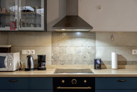 Haus für 4-6 Personen: ca. 90 m² auf zwei Etagen. Im Erdgeschoss befindet sich ein gemütlicher Wohn-/Essbereich mit Kamin und moderner, komplett ausgestatteter Küche. Des Weiteren ein WC. Die erste Etage ist über eine Wendeltreppe erreichbar und bietet zwei Schlafzimmer mit jeweils einem Doppelbett und einem Einzelbett, sowie ein Badezimmer mit Dusche und WC. Beide Schlafzimmer sind mit Klimaanlage ausgestattet und jedes hat einen eigenen großen Balkon mit Ausblick auf die grüne Umgebung.
