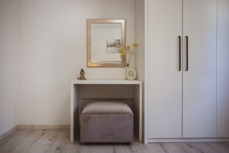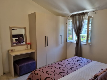 Haus für 7-8 Personen: ca. 172 m², auf drei Etagen. Im Erdgeschoss befindet sich ein Raum mit Fitnessgeräten, eine Sauna sowie ein Badezimmer mit Dusche und WC. Das Erdgeschoss und der erste Stock sind nicht über eine Innentreppe verbunden. Im ersten Stock befinden sich zwei Schlafzimmer, jeweils mit einem Doppelbett und einem Badezimmer mit Dusche und WC. Ein Schlafzimmer ist klimatisiert, das andere zusätzlich mit SAT-TV, einem kleinen Essbereich, einer Küchenzeile und Zugang zum Balkon ausgestattet. Auf dieser Etage befindet sich außerdem ein separates WC mit Waschmaschine. Im zweiten Stock befinden sich zwei weitere Schlafzimmer. Eines ist mit einem Doppelbett und einer Klimaanlage ausgestattet, das andere mit einem Einzelbett und einem Zustellbett (80 x 200 cm) für eine Person. Außerdem gibt es ein Badezimmer mit Dusche und WC. Auf dieser Etage befinden sich zudem eine vollständig ausgestattete Küche mit Essbereich und Wohnraum mit Klimaanlage sowie ein Zugang zu einem Balkon mit Sitzmöbeln.
