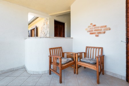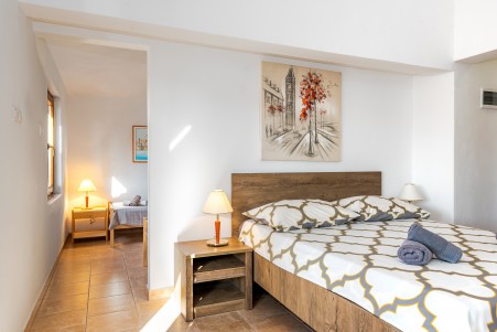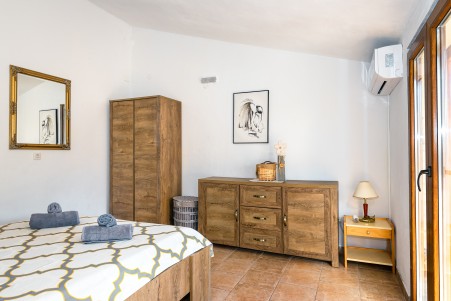 Haus für 16 Personen: insgesamt ca. 250 m², auf zwei Etagen. Im Erdgeschoss befinden sich eine komplett ausgestattete Küche mit Wohn- und Essbereich mit Klimaanlage, zwei Schlafzimmer, jeweils mit einem Doppelbett ausgestattet, sowie ein Badezimmer mit Dusche und WC. Außerdem gibt es im Erdgeschoss, mit separatem Eingang, ein weiteres Schlafzimmer mit Doppelbett und Klimaanlage sowie ein Badezimmer mit Dusche und WC. Über eine Außentreppe gelangt man in den ersten Stock, wo sich drei Wohneinheiten mit separaten Eingängen befinden. Die erste Wohneinheit besteht aus einem Apartment mit zwei Schlafzimmern, jeweils mit einem Doppelbett ausgestattet, einem kleineren Wohnbereich mit Küchenzeile und Klimaanlage sowie einem Badezimmer mit Dusche und WC. Die zweite Wohneinheit verfügt über zwei Schlafzimmer, die durch einen offenen Durchgang miteinander verbunden sind, eine Klimaanlage sowie ein Badezimmer mit Dusche und WC. Die dritte Wohneinheit besteht aus einem Schlafzimmer mit Doppelbett, einer Couch, einer Klimaanlage, Zugang zum Balkon sowie einem Badezimmer mit Dusche und WC.