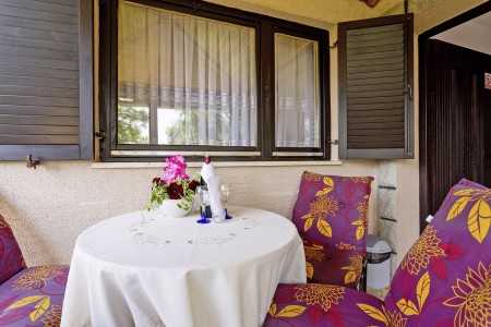 Haus für 6 Personen: ca. 65 m² im Erdgeschoss, drei Doppelzimmer, Küche mit Essbereich, ein Badezimmer mit Dusche und WC, Terrasse mit Sitzgarnitur.