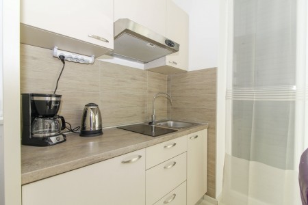 Appartement für 2 Personen: ca. 35 m² im Erdgeschoss des Hauses der Gastgeber-Familie. Das Appartement verfügt über einen Wohnraum mit Küche und Essbereich, ein Schlafzimmer mit Klimaanlage und Doppelbett und ein Badezimmer mit Dusche und WC. Außerdem eine teilweise überdachte Terrasse mit Sitzgarnitur.