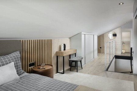 Appartement für 2 Personen: ca. 55 m², in der zweiten Etage, aufgeteilt auf zwei Ebenen. Modern und komfortabel eingerichtet bietet das Appartement im unteren Bereich einen hellen Wohnraum mit Klimaanlage, gemütlicher Couch, komplett ausgestatteter Küche und Essbereich. Außerdem, ein Badezimmer mit Dusche und WC. Oben befindet sich ein Schlafzimmer mit Doppelbett, Klimaanlage und TV.