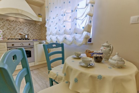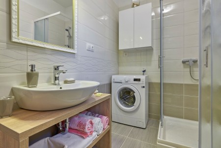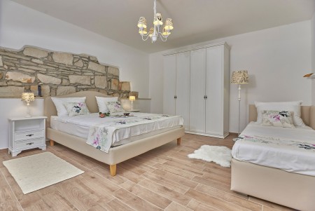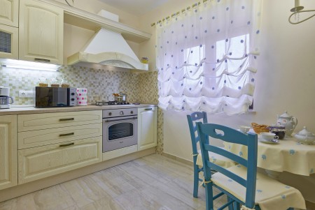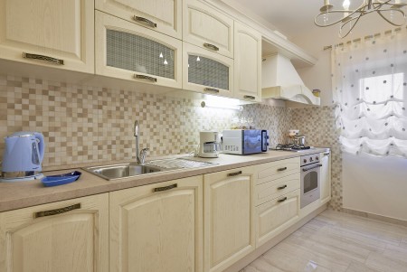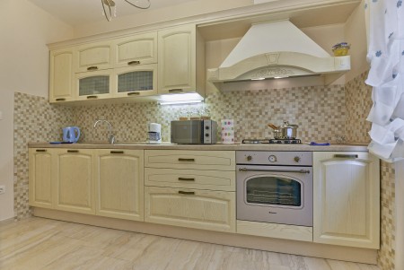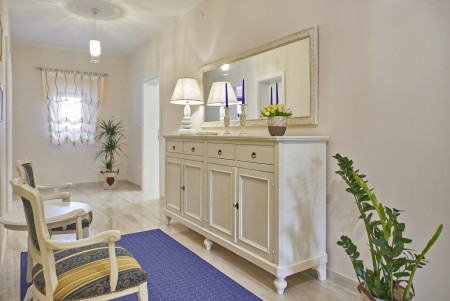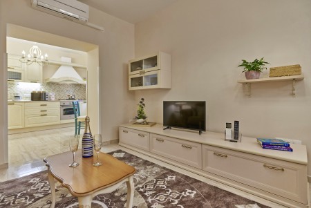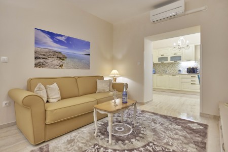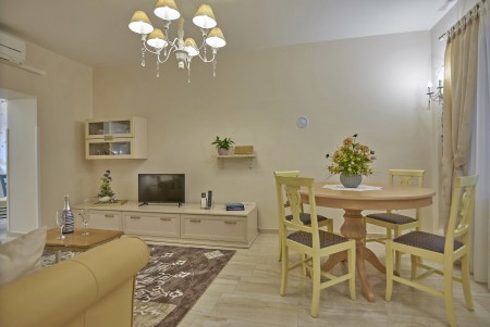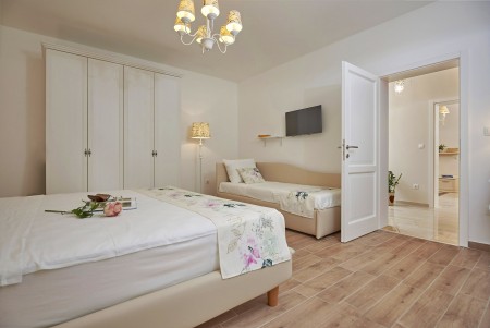 Appartement für 3-5 Personen: ca. 80 m² im Erdgeschoss, modern und geschmackvoll eingerichtet, Eingangsbereich, komplett ausgestattete Küche, Wohnzimmer mit Klimaanlage, ausziehbarer Couch (180 x 200 cm) und Essbereich sowie Ausgang auf die überdachte Terrasse mit Sitzgarnitur. Ein geräumiges Schlafzimmer mit großem Doppelbett und Einzelbett, ein Badezimmer mit Dusche und WC. Flat Screen-TV im Wohnzimmer und im Schlafzimmer.