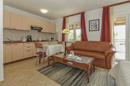1 Appartement für 2 Personen: ca. 48 m² im Dachgeschoss, Klimaanlage, ein Doppelzimmer, Wohnzimmer mit Küche und Essecke, Dusche/WC, Balkon mit Sitzgarnitur. Buchbar nur für zwei Erwachsene.