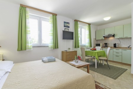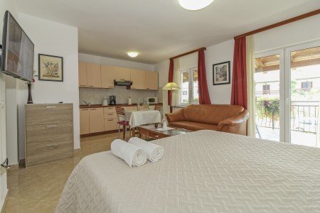1 Studio für 2 Personen ST1: ca. 25 m², in der ersten Etage, Wohn-Schlafraum mit Klimaanlage, Doppelbett (160 x 200 cm), Küchenzeile und Essecke, Badezimmer mit Dusche und WC, überdachter Balkon mit Sitzgarnitur. Buchbar nur für zwei Erwachsene.
