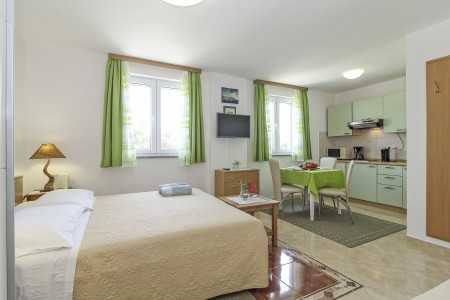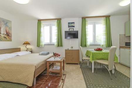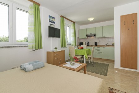 1 Studio für 2 Personen ST2: ca. 25 m², in der ersten Etage, Wohn-Schlafraum mit Klimaanlage, Doppelbett (160 x 200 cm), Küchenzeile und Essecke, Badezimmer mit Dusche und WC. Zur Unterkunft gehört ein überdachter Balkon mit Sitzgarnitur, der über den Haupteingang zugänglich ist. Buchbar nur für zwei Erwachsene.