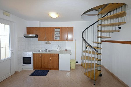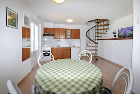 Appartement für 3 Personen AP1: ca. 40 m² auf zwei Ebenen. Separater Eingang im Erdgeschoss über die Terrasse. In der unteren Ebene befindet sich der Wohn-/Essbereich mit Küchenzeile und ein Badezimmer mit Dusche und WC. Eine steile Wendeltreppe führt zur oberen Ebene, wo sich ein Schlafzimmer mit Doppelbett, ein Schlafzimmer mit Einzelbett und ein Badezimmer mit Dusche und WC befinden. Beide Schlafzimmer sind mit Klimaanlage ausgestattet.