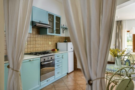Appartement für 4-5 Personen: ca. 75 m² im Erdgeschoss, mit eigenem Eingang und privater Terrasse (ca. 35 m²). Komplett ausgestattete Küche, Wohnzimmer mit Klimaanlage und Essbereich sowie Schlafcouch (90 x 200 cm), zwei Schlafzimmer mit Doppelbett und ein Badezimmer mit Dusche und WC sowie Waschmaschine.