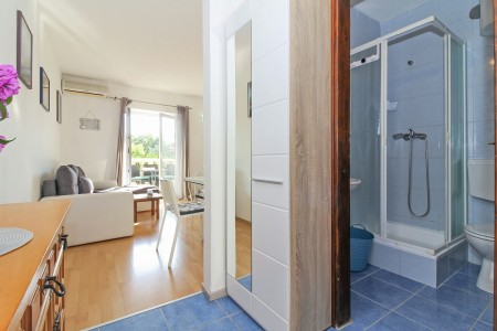 Appartement für 2-3 Personen: ca. 38 m² im Erdgeschoss mit separatem Eingang. Wohn-/Essbereich mit Küche, Klimaanlage, Schlafcouch (140 x 200 cm) und Balkon, ein Schlafzimmer mit Doppelbett und ein Badezimmer mit Dusche und WC.