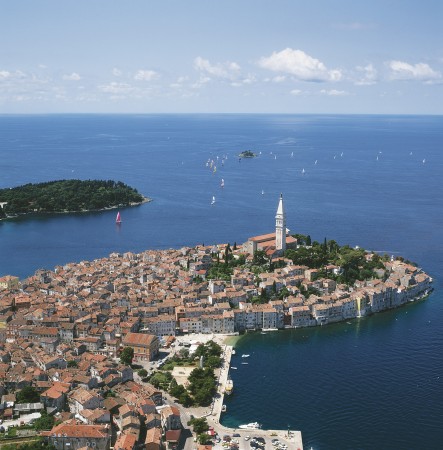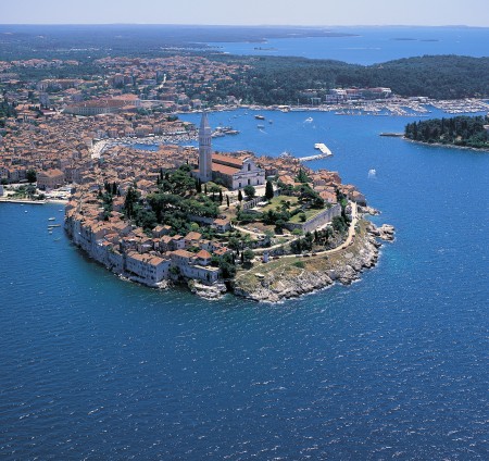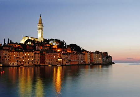 Rovinj, die romantischste Stadt Istriens, wie sie von vielen gerne genannt wird und eine der fotogensten Städte des Mittelmeeres liegt, an der Westküste Istriens. Das Städtchen entstand auf einer kleinen Insel die im Mittelalter mit dem Festland verbunden wurde. Durch seine 1700 Jahre alte Geschichte hinterließen Byzantiner, Ostgoten, Venezianer und Österreicher ihre Spuren in der Architektur des Altstadtkerns, der von der barocken Kirche der Heiligen Eufemija aus dem XVIII Jahrhundert dominiert wird. Der Kirchturm erinnert unverwechselbar an den Kirchturm des Heiligen Markus in Venedig, weshalb Rovinj auch als "Klein Venedig" bezeichnet wird. In der bekanntesten Altstadtgasse „Grisia“ finden sich Kunstgalerien, Ateliers, Restaurants und direkt am Meer gelegene Bars, welche zum Cocktail im Sonnenuntergang mit Blick auf die vorgelagerte Katharineninsel einladen.