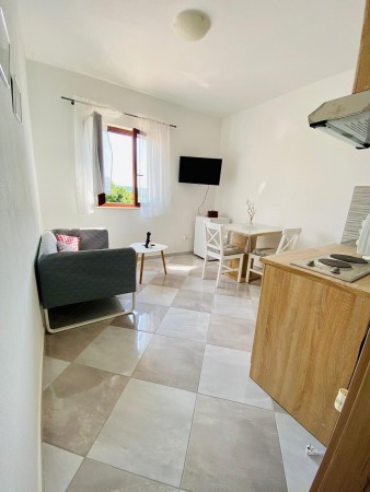 Appartement für 2 Personen AP3: ca. 35 m², in der zweiten Etage. Es besteht aus einem Wohnraum mit Küchenzeile und Essecke, Klimaanlage, einem Schlafzimmer mit Doppelbett sowie ein Badezimmer mit Dusche und WC.