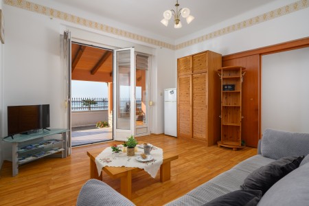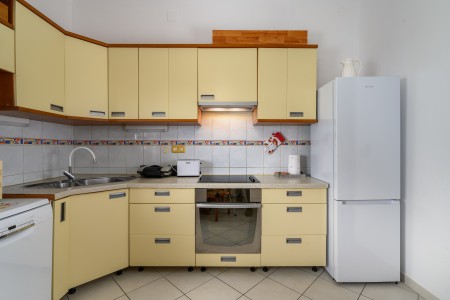 Appartement für 6-8 Personen: ca.100 m², ebenerdig. Komplett ausgestattete Küche mit Esstisch und Klimaanlage, Wohnzimmer mit ausziehbarer Couch (160 x 200 cm) für zwei Personen und direktem Zugang auf die überdachte Terrasse mit Meerblick. Die Ferienwohnung bietet drei Schlafzimmer, die jeweils mit einem Doppelbett ausgestattet sind. Besonders das dritte Schlafzimmer besticht durch seinen direkten Zugang zur Terrasse und den Meerblick. Des Weiteren stehen Ihnen zwei Badezimmer mit Dusche und WC zur Verfügung.