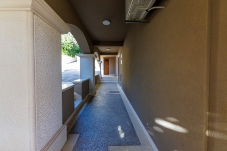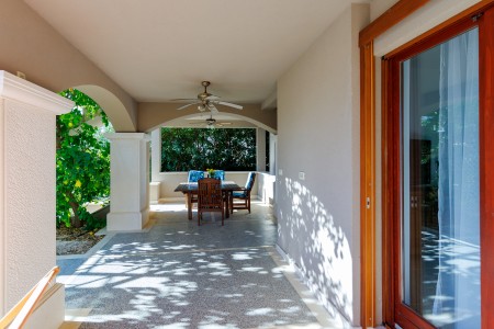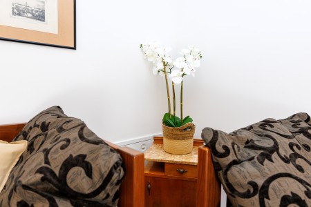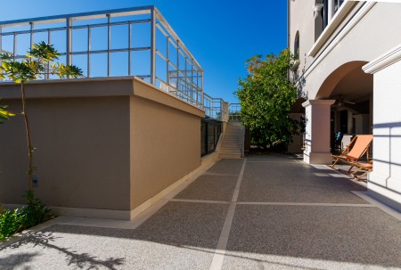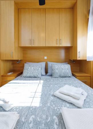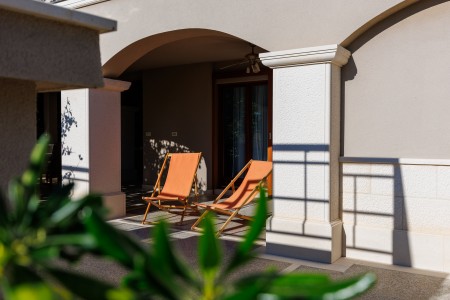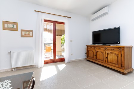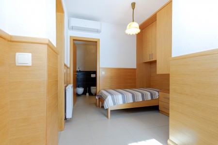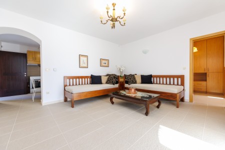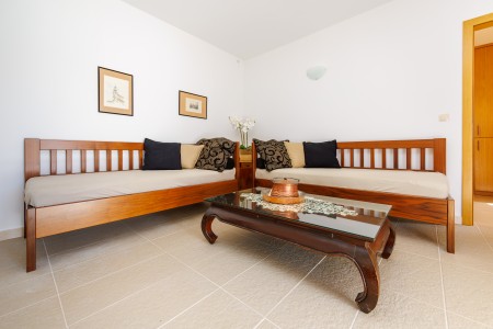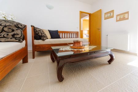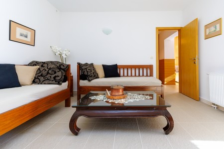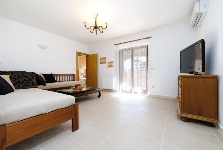 Appartement für 2-4 Personen: ca. 75 m², im Erdgeschoss mit eigenem Eingang. Das Appartement besteht aus einer Küche mit Essecke und Wohnbereich mit Klimaanlage sowie zwei Schlafsofas (je 80 x 200 cm) für je eine Person und Zugang zur Terrasse. Des Weiteren, ein Schlafzimmer mit Doppelbett, Klimaanlage und SAT-TV, sowie ein Badezimmer mit Dusche und WC und ein weiteres mit Badewanne, WC und Waschmaschine.