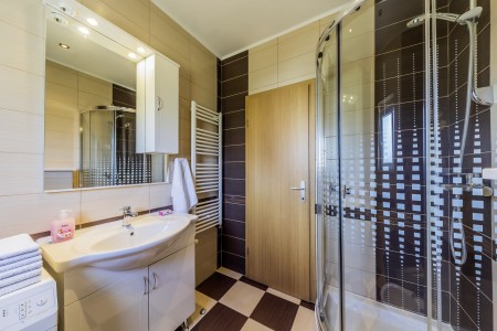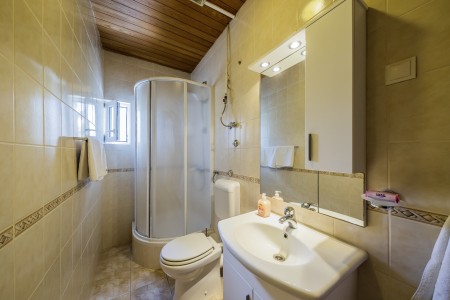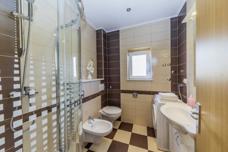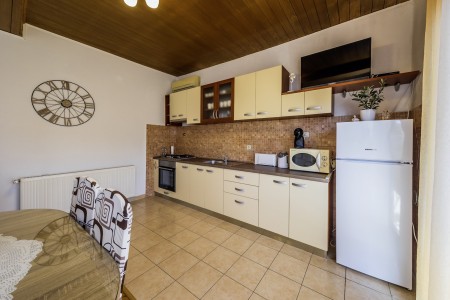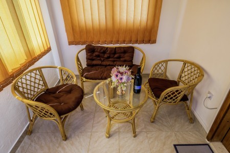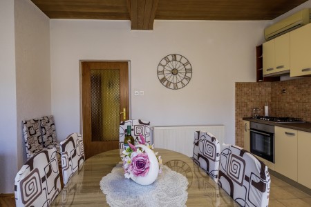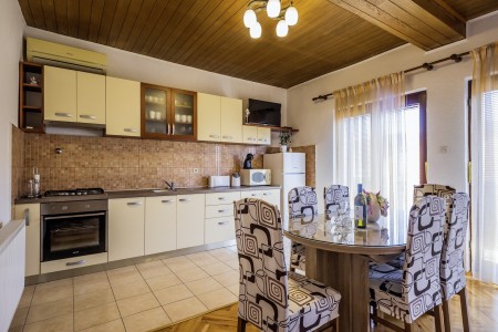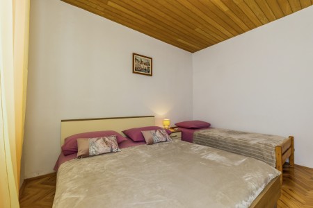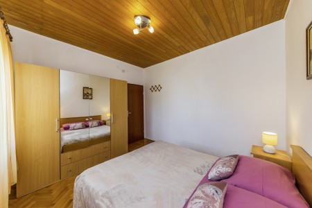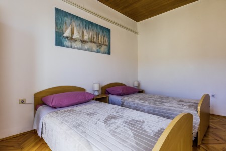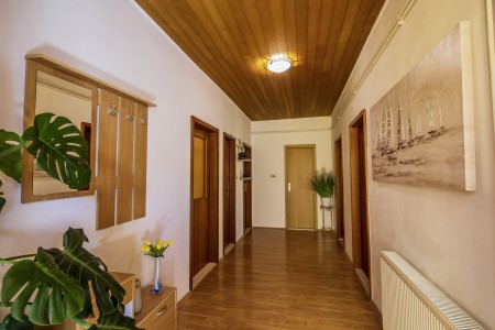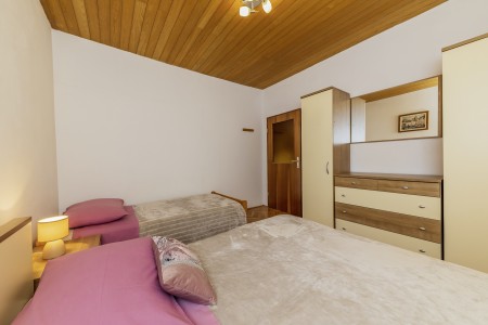 Appartement für 6-7 Personen: ca. 100 m², in der ersten Etage, mit eigenem Eingang. Die geräumige Ferienwohnung bietet einen hellen Wohn-/Essbereich mit Klimaanlage, komplett ausgestatteter Küche mit einer Couch sowie einen Balkon mit Blick auf den Garten. Des Weiteren ein Schlafzimmer mit Doppelbett, ein Schlafzimmer mit zwei Einzelbetten, ein weiteres Schlafzimmer mit Doppelbett und einem Zustellbett (geeignet für ein Kind bis 11,99 Jahre alt) sowie zwei Badezimmer mit Dusche und WC.