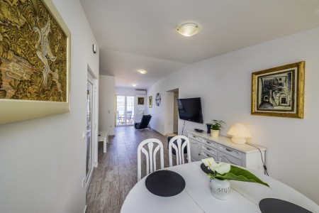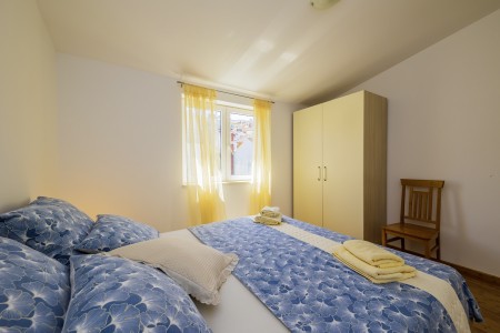 Appartement für 4-6 Personen: ca. 80 m² in der dritten Etage, mit eigenem Eingang. Wohnraum mit Klimaanlage, TV, Esstisch und ausziehbarer Couch (160 x 200 cm) sowie Ausgang auf den Balkon mit Sitzgelegenheiten und herrlichem Meerblick. Komplett ausgestattete Küche. Des Weiteren zwei Schlafzimmer mit Doppelbett und ein Badezimmer mit Dusche und WC. Die Schlafcouch im Wohnraum ist nur für maximal zwei Kinder bis 12 Jahre geeignet.
