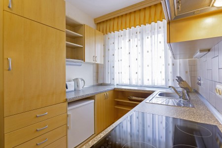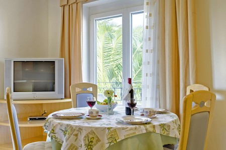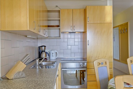 1 Appartement für 2-3 Personen AP2: ca. 40 m² in der zweiten Etage, Klimaanlage, ein Doppelzimmer, Dusche/WC, Waschmaschine, Wohn-Schlafraum mit Schlafcouch und kleinem Balkon, Safe, Küchenzeile mit Backofen, Mikrowellenherd und Geschirrspülmaschine, Esstisch. An allen Fenstern und Balkontüren befinden sich Rollläden und Moskitonetze.