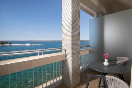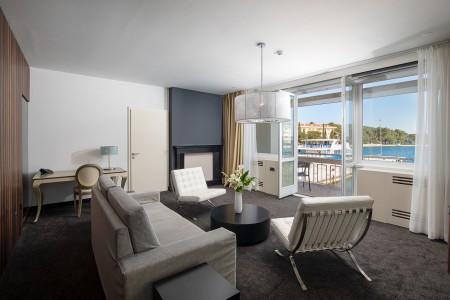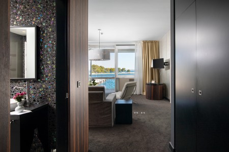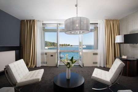 Suite: ca. 50 m², Schlafzimmer mit Doppelbett, Wohnzimmer mit Sofa, zwei Badezimmer, davon eines mit Walk-in Dusche, das andere mit Badewanne. Balkon mit Meerblick.