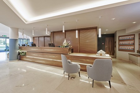 Einrichtungen: Buffet-Restaurant mit Pizza-Ecke, à la carte-Restaurant mit Terrasse, Aperitifbar, Caféterrasse (abends Tanzmusik), Laden mit Strandutensilien und Spielzeug, Geldautomat, Säle für Veranstaltungen, Spieleraum, Süßwasser-Swimmingpool mit separatem Kinderbecken, großzügigen Sonnenterrassen, Sonnenschirmen und Liegestühlen (kostenlos, begrenzte Anzahl), beheiztes Meerwasser-Hallenbad mit Whirlpool, Friseursalon. Miniclub und Animationsprogramm. Teilweise beschatteter Parkplatz (gegen Gebühr, 3 € pro Tag). Als eines der ersten "Bike Hotels" in Istrien verfügt das Haus neben einem videoüberwachten Abstellraum für Fahrräder auch über eine Werkstatt und einen Waschraum für Fahrräder im benachbarten Hotel Laguna. WiFi-Internet im gesamten Hotel (kostenlos).