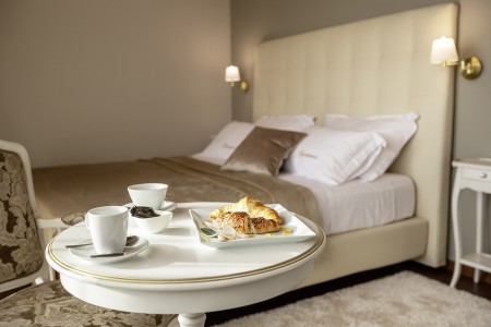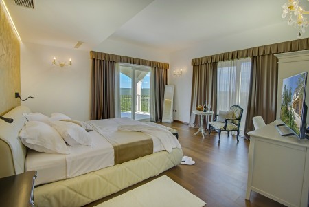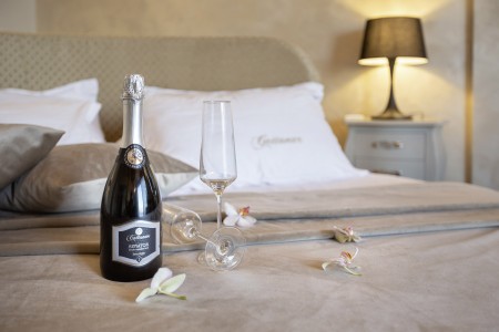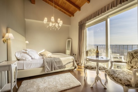 Deluxe Doppelzimmer: ca. 20-25 m², komfortabel und romantisch eingerichtet bieten alle Deluxe Doppelzimmer Klimaanlage, Flachbild-TV, Minibar, Safe, WiFi-Internet (kostenlos), Badezimmer mit Dusche und WC, französischen Balkon mit herrlichem Blick auf die Weinberge.