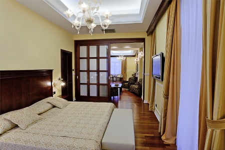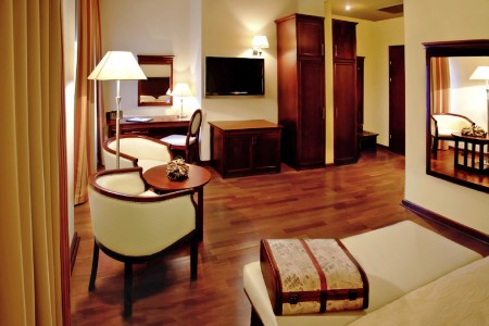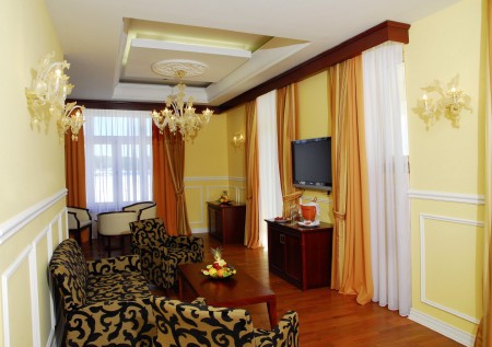 Suite: ca. 70 m², separater Wohnbereich, ein Badezimmer mit Hydromassage-Wanne, zweites Badezimmer mit Dusche, zur Meerseite gelegen. Bei Anreise Sekt und frisches Obst im Zimmer.