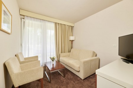 Suite: ca. 33 m², Schlafzimmer mit Doppelbett, separates Wohnzimmer mit Schlafcouch (110x170 cm), Balkon (ca. 7 m²) zur Meerseite.