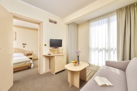 Suiten: ca. 31 m², Doppelzimmer und Vorzimmer mit Schlaf-Couch (110x180 cm), Balkon zur Park- oder zur Meerseite.