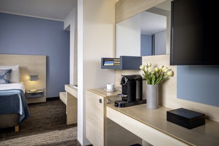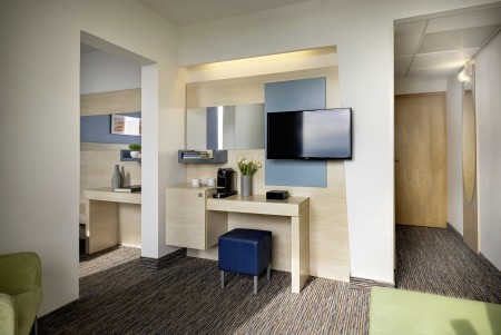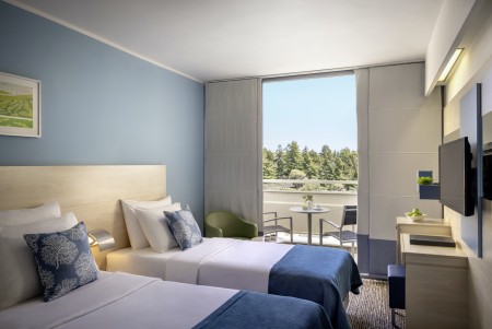 244 Zimmer: mit Klimaanlage, Telefon, WiFi-Internet (kostenlos), LCD-Fernseher, Safe, Minibar, und Dusche/WC. Babybett auf Anfragen (gegen Gebühr, 5 € pro Tag) möglich.