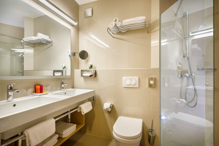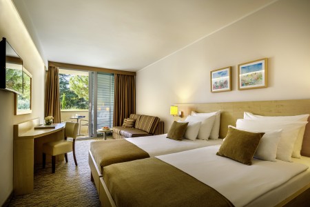Familienzimmer Superior: ca. 27-34 m², im neuen Flügel gelegen, ein Schlafzimmer mit Doppelbett, durch Schiebetür abgetrennter Wohnbereich mit zwei Tagesbetten (Sofas je 80x190 cm), Dusche/WC, Balkon zur Parkseite.