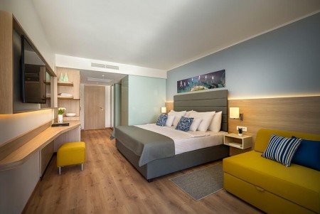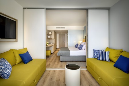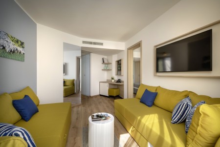 Junior-Familiensuite: ca. 28-32 m², ein Schlafzimmer mit Doppelbett oder zwei Einzelbetten, Wohnraum mit Doppel-Schlafcouch (160x200 cm) und Schreibtisch, Bad/WC, Balkon. Wahlweise buchbar zur Parkseite oder zur Meerseite.