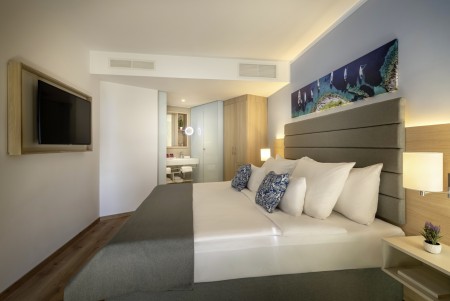 Familien-Suite Superior: ca. 42-50 m², zwei Schlafzimmer mit Doppelbett, separater Wohnbereich mit Schlafcouch, Dusche/WC, Balkon.