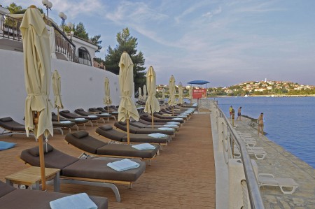 Strand: Zum Felsstrand mit Steinflächen, Liegewiesen, Strandbar und Restaurant sind es etwa 50 m.