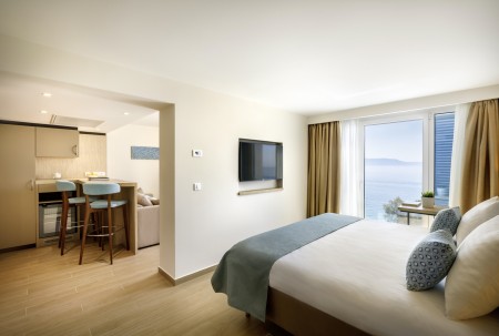 Junior Suite: 29-32 m² bestehend aus Schlafzimmer mit Doppelbett, Wohnzimmer mit Schlafsofa (200 x 200 cm), LCD SAT-TV im Schlafzimmer und im Wohnzimmer, wahlweise buchbar zur Parkseite oder zur Meerseite.