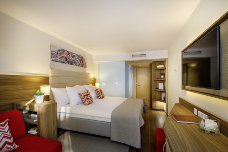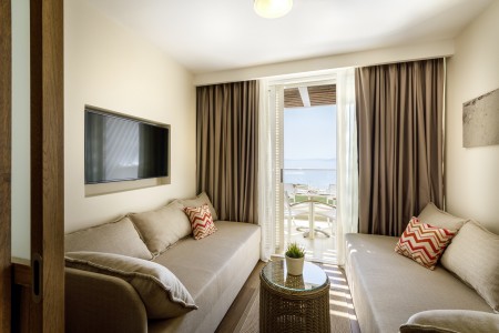 Suite: ca. 36-39 m² bestehend aus Schlafzimmer mit Doppelbett sowie separatem Wohnzimmer mit zwei Sofabetten. LCD SAT-TV im Schlafzimmer und im Wohnzimmer, Balkon oder Terrasse. Wahlweise auch buchbar mit Meerblick.