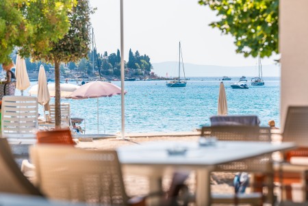 Strand: Zum flach abfallenden Kiesstrand mit Grill-Restaurant, Sonnenschirm- und Liegestuhlverleih sind es nur wenige Schritte.