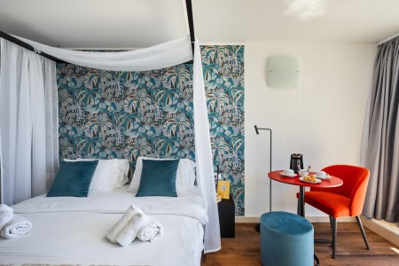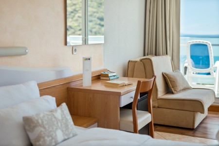 Doppelzimmer Deluxe: ca. 20 m², modern eingerichtet, LCD-TV, Minibar und Wasserkocher und Balkon zur Meerseite.