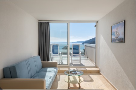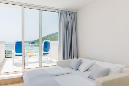 Familienzimmer Standard: ca. 30 m², mit zusätzlicher Schlafcouch (140x190 cm) für zwei Personen und Balkon zur Meerseite.