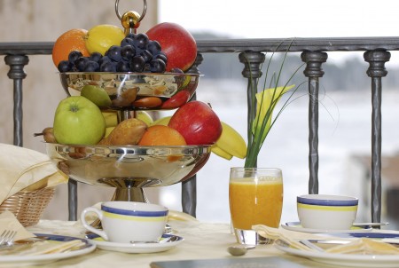 Verpflegung: Frühstücksbuffet. Das Frühstück kann wahlweise im Frühstücksraum oder bei schönem Wetter auf dem Balkon mit Blick auf den Hafen eingenommen werden.