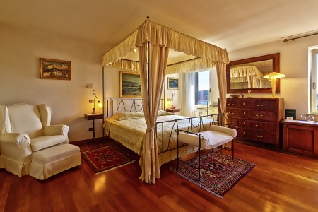 Suite Superior: ca. 40 m², in der 3. Etage gelegen, verfügt über ein Doppelbett mit Baldachin, Sessel sowie ein Bad mit Hydromassage-Wanne.