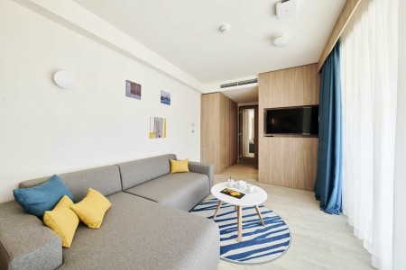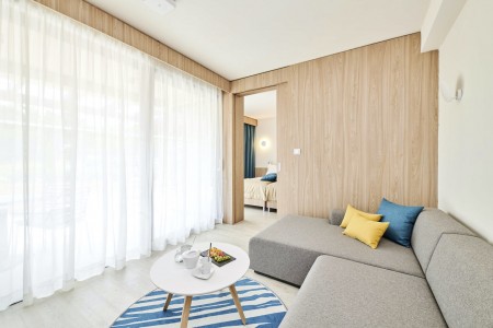 Superior Suite: ca. 32 m² im Erdgeschoss oder in der ersten Etage, modern und komfortabel eingerichtet, ein Schlafzimmer mit Doppelbett oder zwei Einzelbetten, separates Wohnzimmer mit ausziehbarer Couch (140x200 cm) für bis zu zwei Kinder, Badezimmer mit Dusche und WC, Balkon oder Terrasse mit Blick auf den Park.