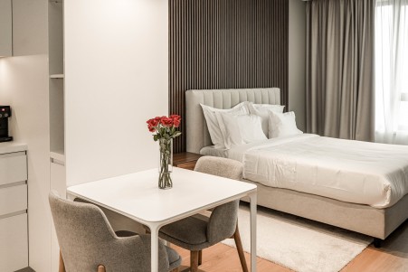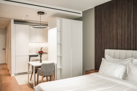 Studio Deluxe: ca. 32-34 m², mit Doppelbett (160x200 cm) und voll ausgestatteter Küche (Kühlschrank, Geschirrspüler, Ofen und Kochfelder, Kaffeemaschine), kleiner Essbereich, außerdem Klimaanlage, smart SAT-TV, Safe, Waschmaschine/Trockner, WiFi-Internet (kostenlos) und Dusche/WC. Babybett auf Anfrage kostenlos möglich.