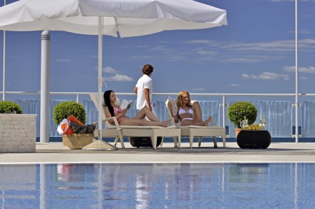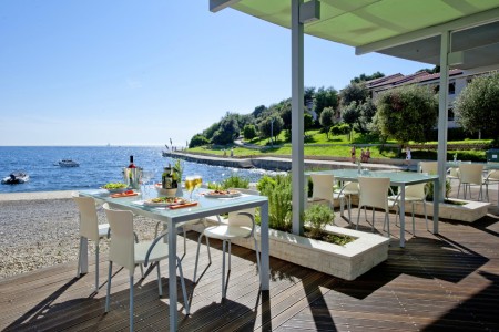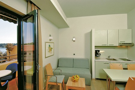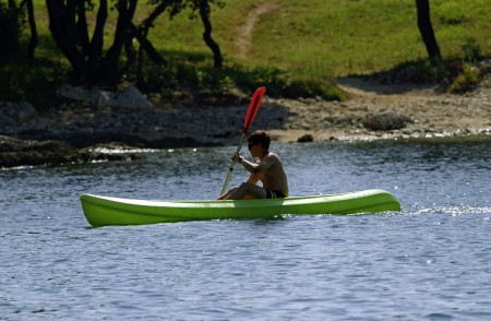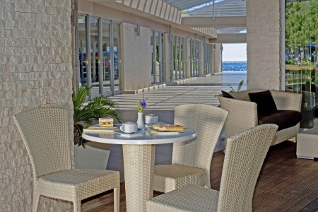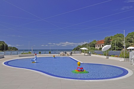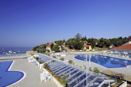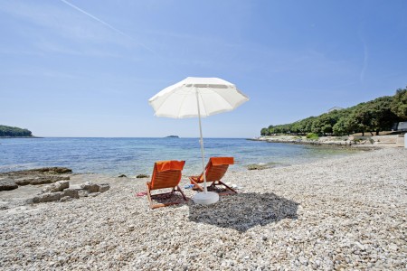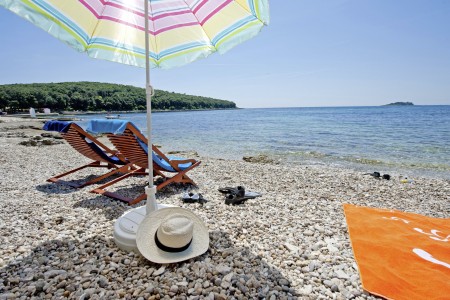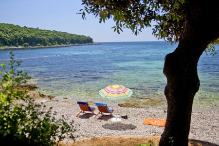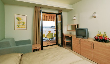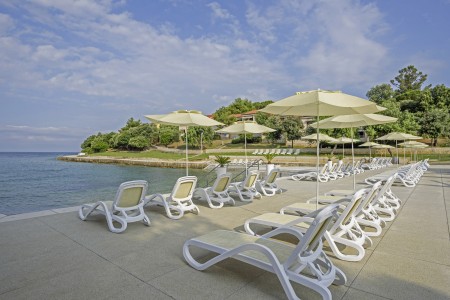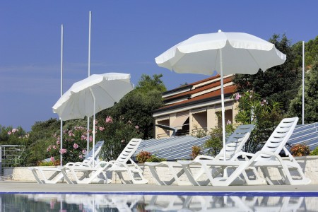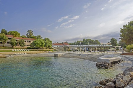 Strand: Zum langen Felsstrand mit betonierten Liegeflächen und einer kleinen Kiesbucht sind es je nach Unterbringung etwa 50 bis 150 m. Sonnenschirme und Liegestühle gegen Gebühr. Außerdem Duschen, Umkleidekabinen und Sonnenterrasse mit Zugang zum Meer.
