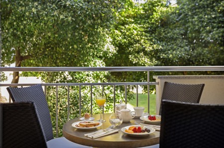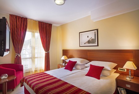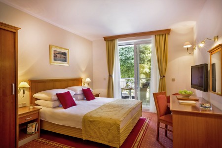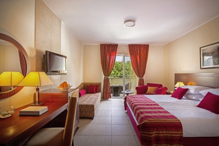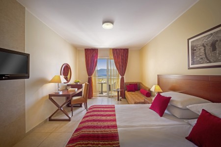 Doppelzimmer: ca. 29 m², Doppelbett oder zwei Einzelbetten und zusätzliches Schlafsofa. Wahlweise buchbar mit Balkon zur ruhigeren Parkseite oder mit Balkon mit Meerblick.