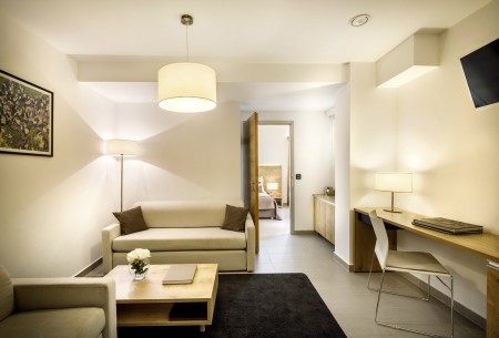 Suite Standard: ca. 37 m², ein Schlafzimmer mit Doppelbett, Wohnraum mit Doppel-Schlafcouch (160 x 200 cm), Badezimmer mit Dusche und WC.