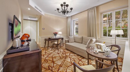 51 Zimmer und Suiten: luxuriös und elegant eingerichtet, mit Klimaanlage, interactive SAT-TV, Kaffee-/Teekocher inklusive einer großen Auswahl an Kaffee und Tee (tägliche Befüllung im Preis enthalten), Minibar (tägliche Befüllung mit Wasser und Säften im Preis enthalten), Safe, Telefon, WiFi-Internet (kostenlos), Bad oder Dusche/WC mit hochwertigen Pflegeprodukten, Bademänteln und Pantoffeln. Roomservice 24 Stunden verfügbar.