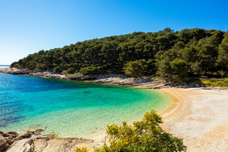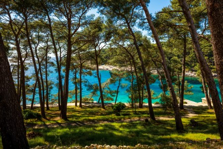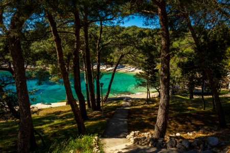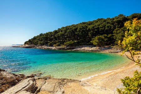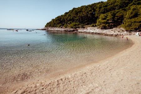 Strand: Zum Felsstrand mit Liegeflächen, Sonnenschirmen und Liegestühlen (gegen Bezahlung) sind es rund 50 m über Treppen und Wege durch den Pinienwald, zur Kiesbucht „Veli Žal“ mit Restaurant-Terrasse etwa 100 m.