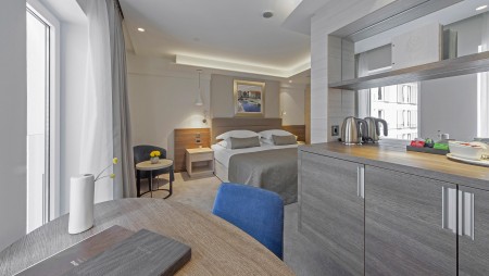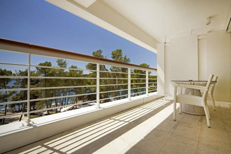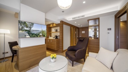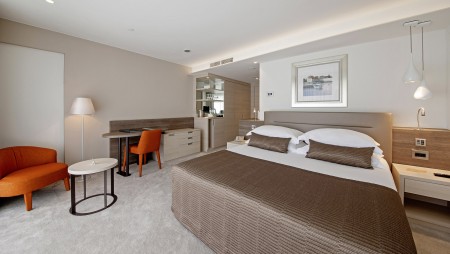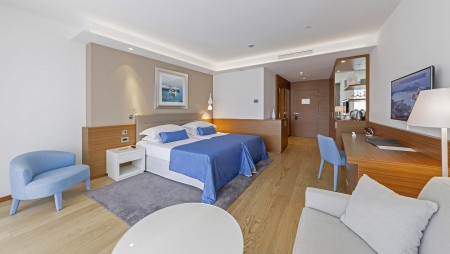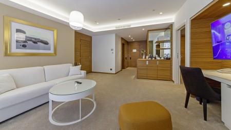 Junior Suite: ca. 46 m², Schlafzimmer, Wohnzimmer mit Schlafcouch, begehbarer Kleiderschrank, zwei Badezimmer, große Terrasse (ca. 25-35 m²), zur Park- oder zur Meerseite gelegen.