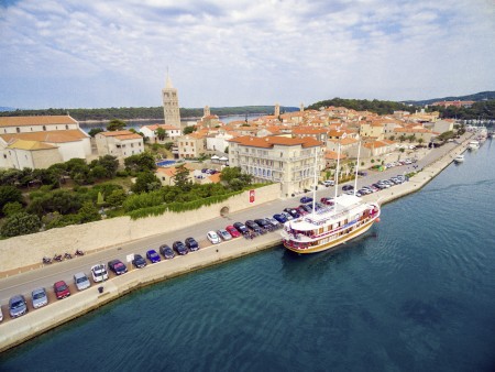 Rab, der Hauptort der gleichnamigen Insel, liegt beeindruckend auf einer schmalen Landzunge an der Südwestküste und konnte sein mittelalterliches Stadtbild mit den engen Gassen und markanten Glockentürmen bewahren. Heutzutage in erster Linie bekannt durch seine zahlreichen und komfortablen Hotels, Ferienanlagen und Privatunterkünfte ist Rab eine Stadt mit reichem Kulturerbe. Für die Entwicklung des Fremdenverkehrs waren das angenehme Klima, das kristallklare Meer, viele kulturhistorische Denkmäler, die schöne Natur sowie die Gastfreundlichkeit der lokalen Bevölkerung entscheidend. Fähren und Schnellboote verbinden die Insel mit dem Festland (Jablanac) und mit der Insel Krk. Für Aktivurlauber gibt es in Rab viele Sport- und Freizeitangebote – sei es zu Wasser oder zu Lande. Neben Tauchen, Wasserski fahren, Windsurfen, Bootsverleih und Jetski, wird auch Tennis, Beach-Volleyball, Minigolf, Boccia, Basketball, Radfahren und Vieles mehr angeboten. Ausflugsmöglichkeiten: Besichtigung der Insel und der Stadt Rab, Panoramafahrt mit dem Boot, Nationalpark Plitvicer Seen.