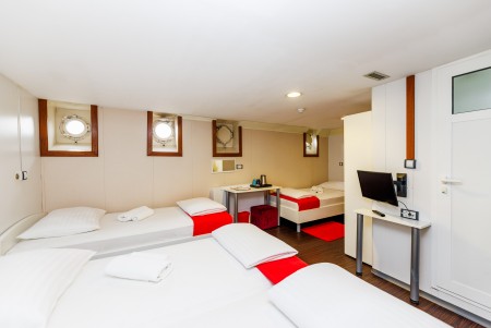 35 Zimmer: modern und komfortabel eingerichtet, verfügen alle Zimmer über Klimaanlage, Heizung, Leselampen, WiFi-Internet (kostenlos), Bullauge und Dusche/WC. Neben Einzel- und Doppelzimmern sind auch 3- und 4-Bettzimmer sowie Mehrbettzimmer mit Etagenbetten für 4 bis 6 Personen verfügbar.
