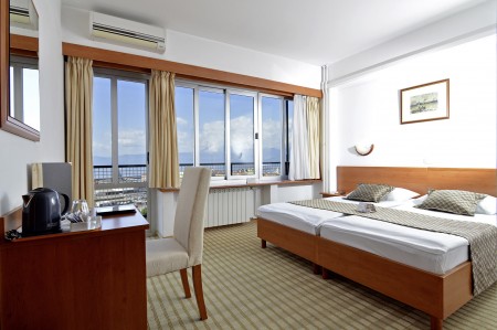 Standard Zimmer: ca. 15 m², zur Meerseite gelegen, meist mit Balkon und Ausblick über Rijeka und die Kvarner Bucht.